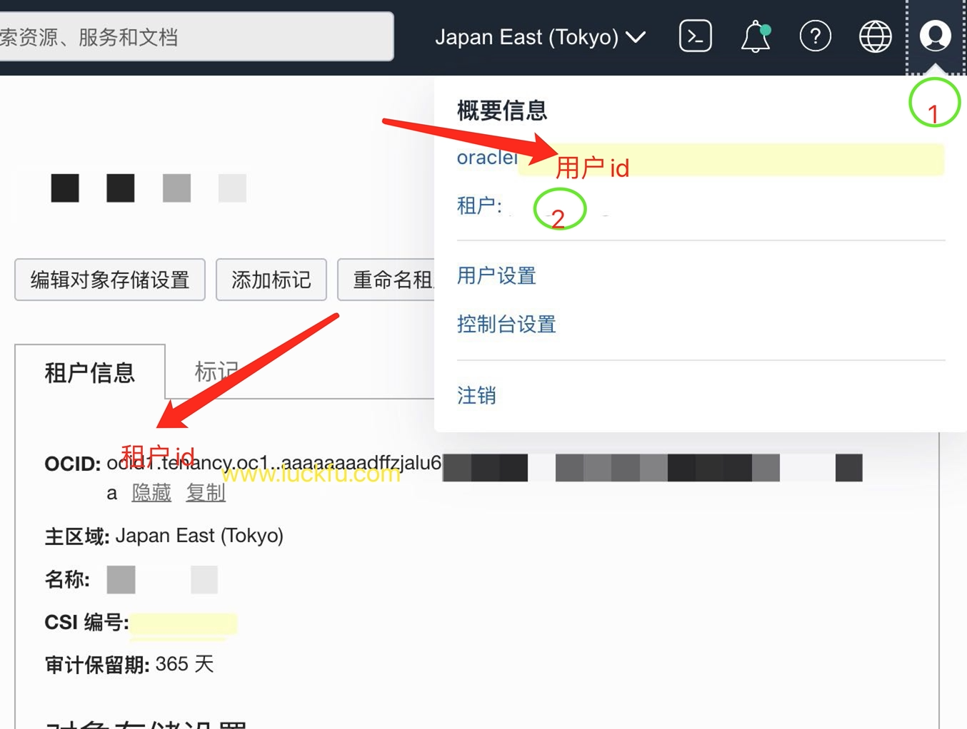 在oracle cloud控制台上,点击右上角头像=>菜单中选择“用户设置” 复制用户和租户ID